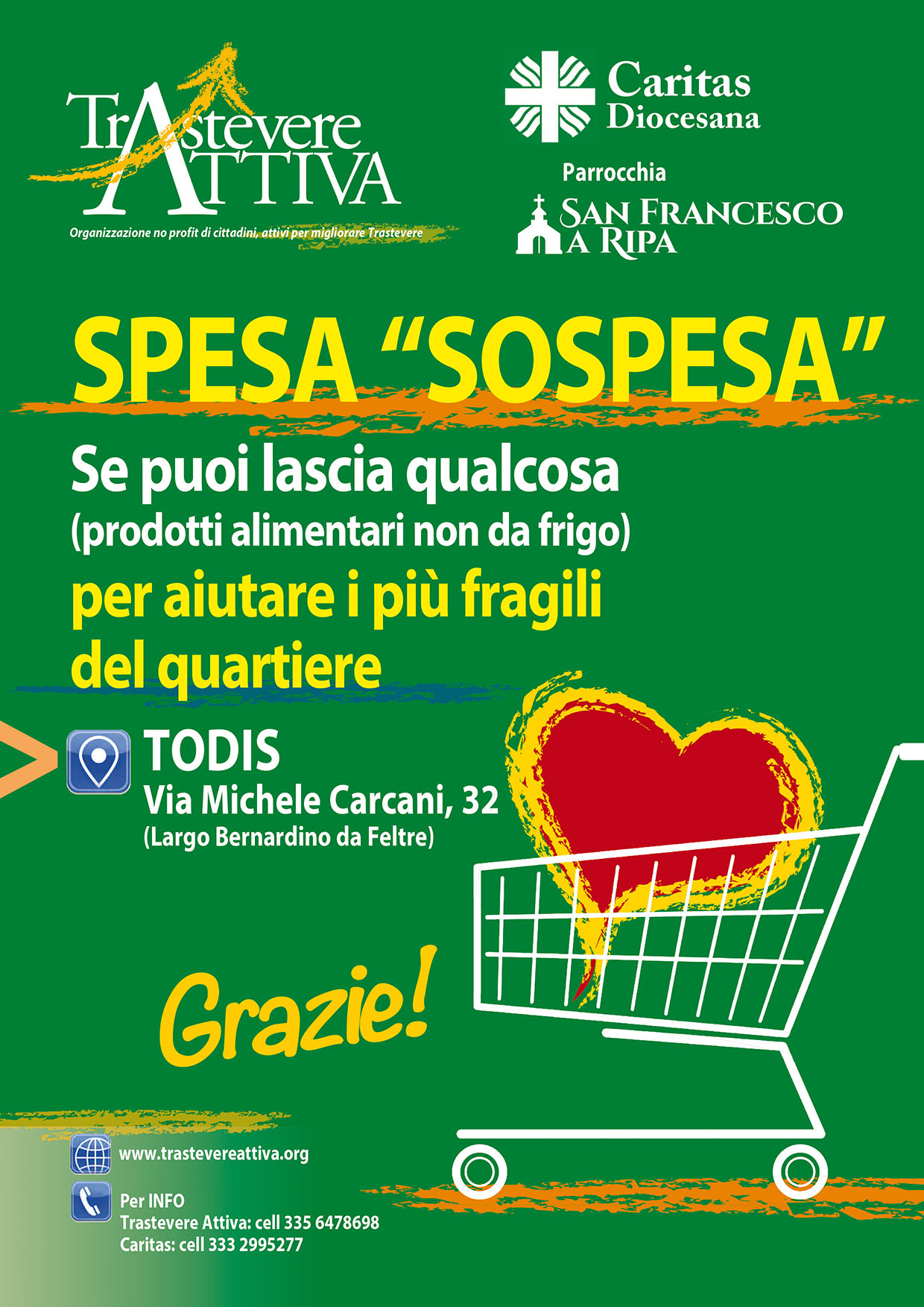 Il nostro CARRELLO DELLA SPESA SOSPESA si trova presso il TODIS di via Michele Carrani (poco dietro Largo Bernardino da Feltre, su viale Trastevere). Qui sono stati raccolti e consegnati alla Caritas ben 42 carrelli stracolmi di prodotti alimentari che hanno consentito di aiutare 44 famiglie (alcune con bambiini) e distribuire pacchi alimentari a circa 40 senza-fissa-dimora.